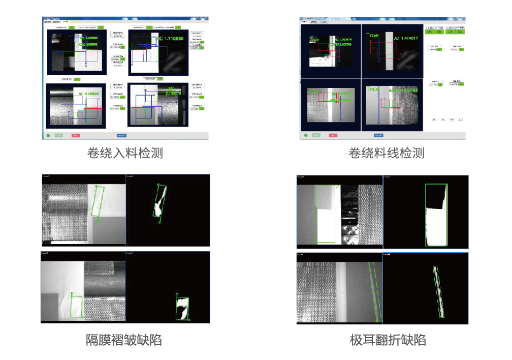 卷繞機是鋰電池成型的主要設備,通過驅動卷針將正負極片和隔膜按照特定的次序卷繞從而形成電芯,在此過程中,需使用視覺進行對齊度糾偏,同時識別相機視野范圍內的涂布、隔膜缺陷,以保證產品質量。我司采用KINOVISION視覺檢測平臺對卷繞過程中的陰陽極距離和整體電芯的尺寸進行檢測,同時創新采用深度學習相關算法,實時檢測涂布和隔膜的各類缺陷,提升產品質量,該方案已批量應用于鋰電客戶。